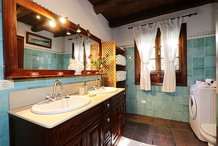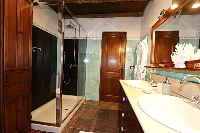 Geräumiges Bad mit einem Waschtisch mit Doppelwaschbecken, WC und begehbarer Dusche und auch die Waschmaschine steht hier.