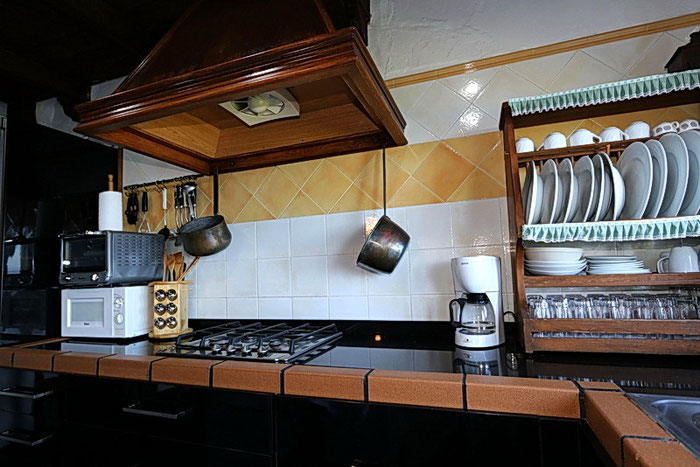 Voll ausgestattet mit extra Kaffeemaschine, Toaster, Mikrowelle und kleinem Backofen.